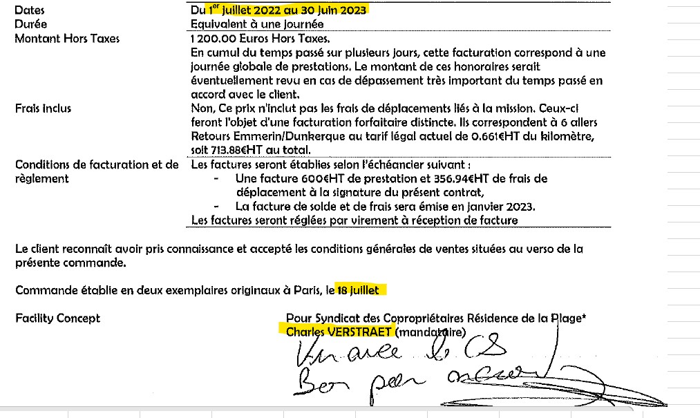Le 18 juillet 2022, sans soumission et présentation du contrat à l’Assemblée Générale, Immo de France souscrit un contrat avec une société de portage salarial pour que son représentant puisse contre rémunération et indemnisation exercer une « Mission de conseil et d’assistance concernant le chauffage de la Résidence de la plage. »